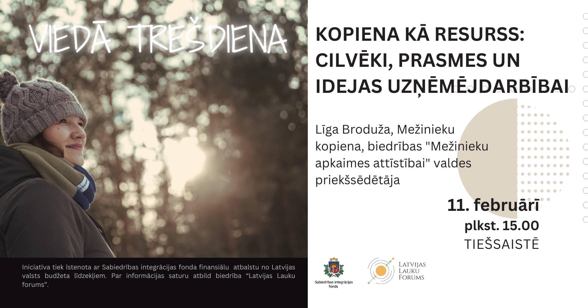 Šīs Viedās trešdienas sarunā savu kopienas un Viedā ciema pieredzi stāstīs Līga Broduža – Mežinieku kopienas pārstāve, biedrības Mežinieku apkaimes attīstībai valdes priekšsēdētāja. Runāsim par to, kā no vietējiem cilvēkiem, prasmēm un idejām rodas dzīvotspējīgas iniciatīvas un uzņēmējdarbība.