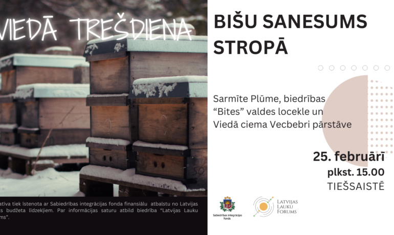 Viedā trešdiena – “Bišu sanesums stropā” 25. februārī plkst. 15.00 Viedās trešdienas ietvaros aicinām uz sarunu par kopienas spēku, darīšanu un to neredzamo enerģiju, kas liek vietām augt un cilvēkiem iesaistīties. Par Vecbebriem un Viedā ciema ceļu stāstīs Sarmīte Plūme, biedrības “Bites” valdes locekle un viena no Viedā ciema Vecbebri virzītājām. Stāsts “Bišu sanesums stropā”