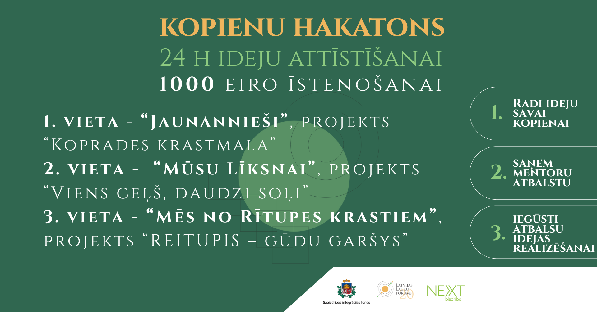Latvijas Lauku forums izsaka pateicību visām komandām par dalību un ieguldīto darbu, mentoriem par profesionālu atbalstu, kā arī žūrijas locekļiem par vērtīgo vērtējumu un ieteikumiem. Paldies arī visiem skatītājiem, kas sekoja līdzi tiešsaistes noslēguma prezentācijām.