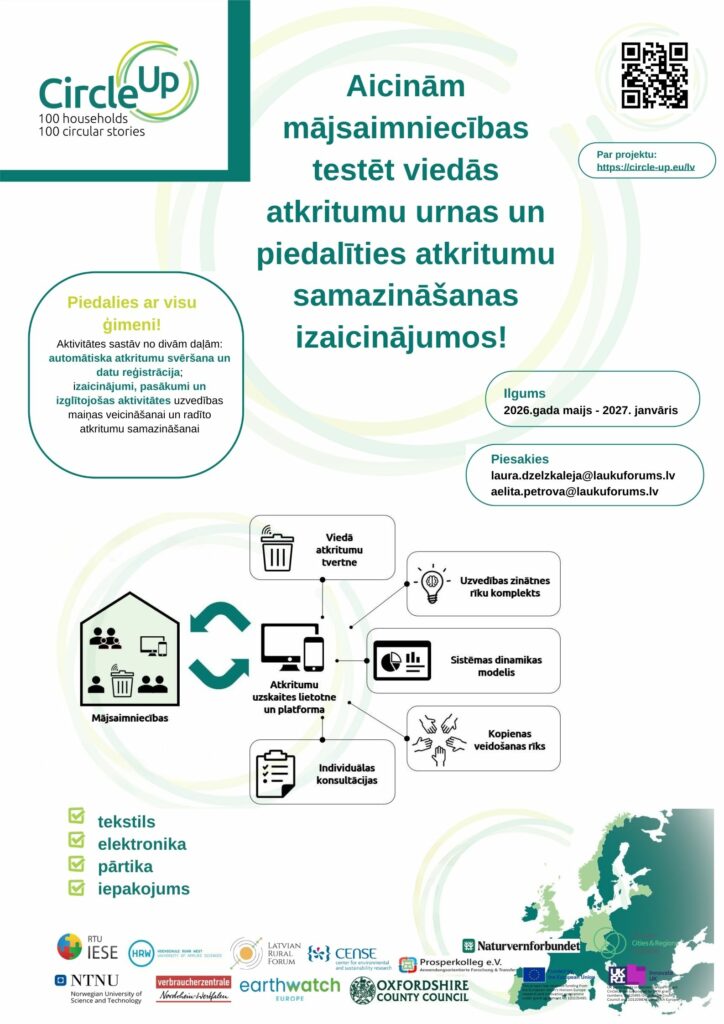Vai Jums rūp vide un ilgtspējīgāki ikdienas paradumi? Aicinām Cēsu, Valmieras un Preiļu, Līvānu novadu mājsaimniecības iesaistīties CircleUp Horizon Europe pētniecības projektā, kura mērķis ir izzināt atkritumu rašanās paradumus un piedāvāt veidus to samazināšanai.